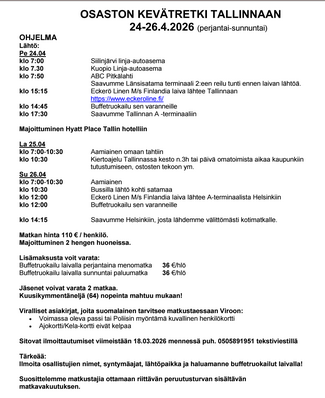Osasto 091:n pikkujoulut Kuopion kaupunginteatterissa la 13.12.2025 kello 18.00. Esitys: Täydellinen resepti. Väliajalla kahvitarjoilu. Omavastuu 25e\henkilö. Jäsen voi ottaa mukaansa myös puolison. 100 ensimmäistä mahtuu mukaan. Ilmoittautumiset ja mahdolliset ruoka-allergiat txt-viestillä numeroon 050-5891951 viimeistään 24.10.2025 mennessä. Liput jaetaan noin 30min ennen esityksen alkua aulassa.